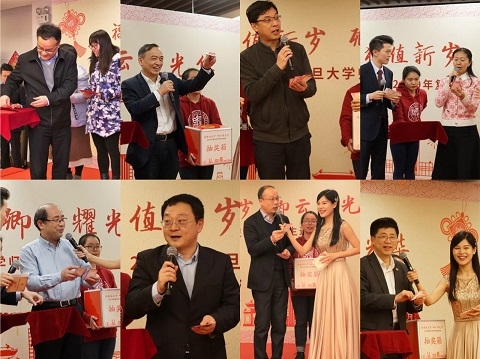 两场迎春会上,师生们不仅享受到了美味丰盛的年夜饭,还欣赏了阿卡贝拉人声合唱、古筝演奏、京剧、相声、魔术、武术、歌舞等精彩节目。参与表演的不仅有中外学生,还有老师和已经毕业的校友,以及来自学生生活园区的管理督导员。迎春会中穿插了“福旦知否”、“福聚复旦”、“猪年要团圆”等互动游戏,抽取了“如有神助”、“胸有成竹”、“字字珠玑”、“掌上明珠”等奖项,现场其乐融融,高潮迭起,师生共享了一场复旦版“春晚”。最后,迎春会在厨师和服务员登台,全场同唱“新年好”的歌声中落幕。