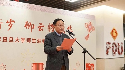 上海市教育委员会副主任倪闽景向留校师生致以节日的问候并向学生代表发放慰问红包。倪老师不仅与在场师生共同回顾过去一年复旦所取得的突破进展和重要时刻,同时展望未来,勉励同学们要强健身体,学习好、生活好,为社会发展多做贡献。