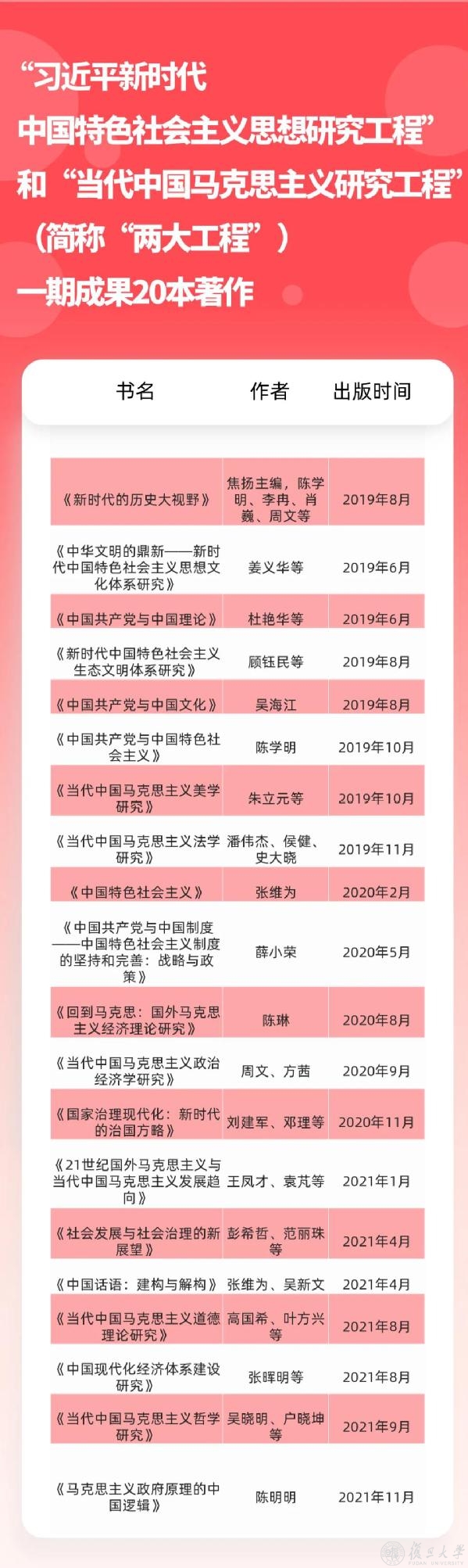 党的十九大闭幕后不久,在上海市委宣传部的大力支持下,复旦大学在全国率先启动实施了“两大工程”,整合全校马克思主义学术资源和人才资源,开展滚动式研究,产出了一系列重要研究成果,设置“新时代中国特色社会主义理论体系研究”等6个系列、35个项目,出版20本专著,对新思想开展基础性研究、战略性研究、全局性研究、系统性研究,力图讲清讲透当代中国马克思主义、21世纪马克思主义的道理学理哲理。