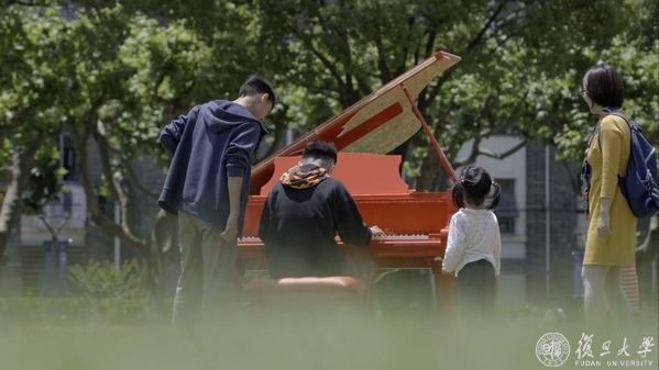一如往常的复旦校园里,出现了一架不同寻常的红色钢琴。