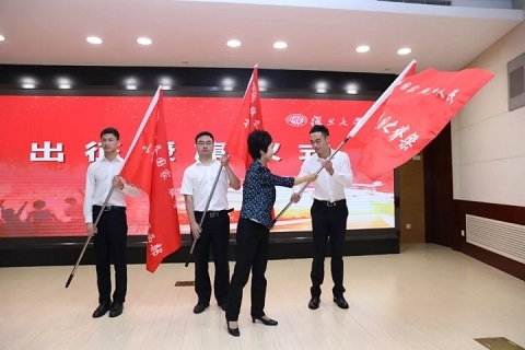 旗帜在飘扬,梦想将起航。授旗出征环节,焦扬为即将赴西部、基层、国家重点单位就业的毕业生代表授出征大旗,尹冬梅及地方组织部门代表及校友会代表为各省(区、市)的选调生、专招生代表授旗。