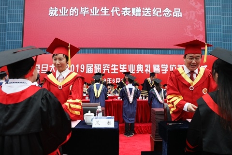 典礼上,2019届全体毕业研究生向母校送上毕业纪念品喷涂画卷《聚沙成塔》,寓意复旦学子将团结一心,凝聚共识,自强不息,奋力拼搏,以累累硕果助力母校“双一流”建设。焦扬代表学校接受毕业纪念品。