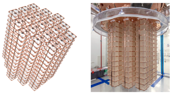 CUORE探测器由19个极高纯度的TeO2晶体塔组成,每个晶体塔由52个晶体构成,988块TeO2晶体总重741公斤;另外CUORE合作组还设计建造了能够冷却19个晶体塔至绝对零度附近(10mK)的低温器。该低温器已于2014年9月份试运行,成功把1立方米的体积冷却到6mk,创造了宇宙中最冷的立方体。绝对零度附近的TeO2晶体是一个具有极高灵敏度的量热探测器,实验中通过TeO2晶体极其细小的温度变化(K)来测量单次核衰变释放出来的能量。