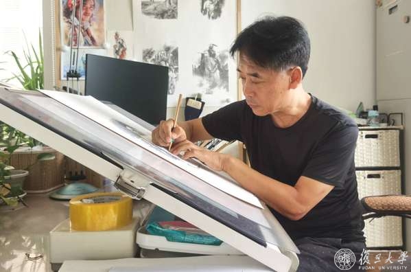 “为了让画面更为生动和感人,我设计了陈望道一手执笔工作,一手拿着粽子的情景。他微低着头,表情严肃地专注于译稿,吃粽子成为了他下意识的动作。这个场景让人感到他已超然于物外,‘真理’感动和鼓舞着他。柴屋破败,山区早春的寒风肆意蹿进屋来,他浑然不觉。纵是一豆灯火,却如沐万丈光芒。”