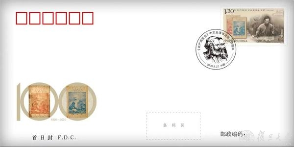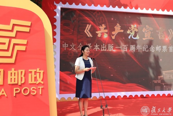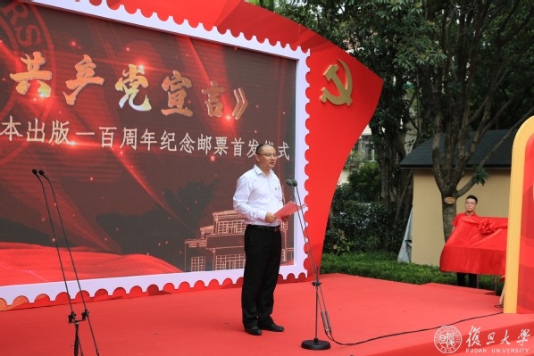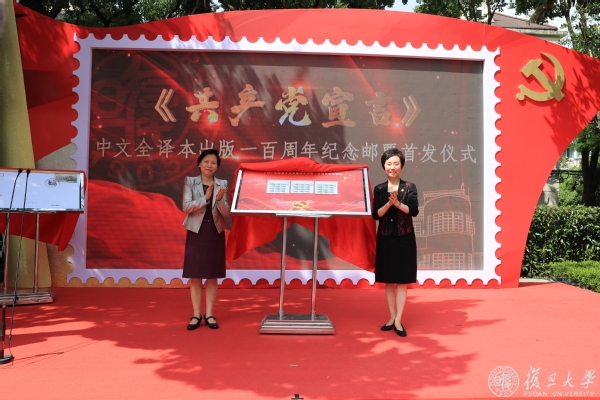 复旦大学党委副书记、副校长周亚明与著名邮票设计师、鲁迅美术学院教授、纪念邮票设计师李晨共同为《共产党宣言》中译本出版一百周年首日封揭幕。