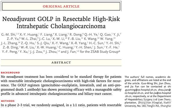 3月5日,《新英格兰医学杂志》(The New England Journal of Medicine)重磅发布复旦大学附属中山医院樊嘉/周俭/施国明团队的最新临床研究成果《新辅助GOLP方案在可切除、伴高危复发肝内胆管癌研究》(“Neoadjuvant GOLP in Resectable High-Risk Intrahepatic Cholangiocarcinoma”)。
