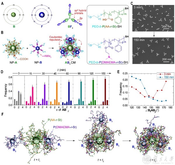 图2.聚合物修饰的纳米粒子定向键合形成纳米尺度“人造分子”。(A)典型的硼(B)和氟(F)原子结构以及BF3的分子结构。(B-F)纳米粒子反应形成BF3型 “人造分子”的过程图示(B);不同反应时间下,产物的扫描电子显微镜照片(C); “人造分子”产率统计分布随反应时间变化(D); 不同反应时间,所得 “人造分子”内键角的统计分布(E);计算机模拟 “人造分子”的成键过程(F)。