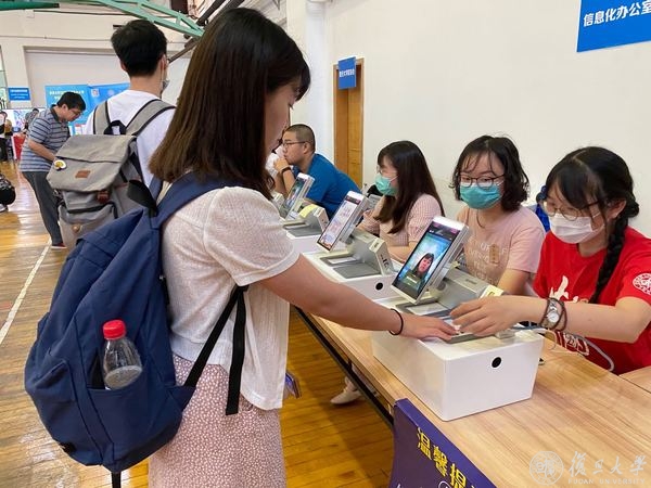 在张江校区,相关院系负责接待人员早早来到迎新现场,布置有关场地,并会同信息办老师安排好人脸识别自助报到,为新生们提供顺畅、高效、暖心的入学服务。