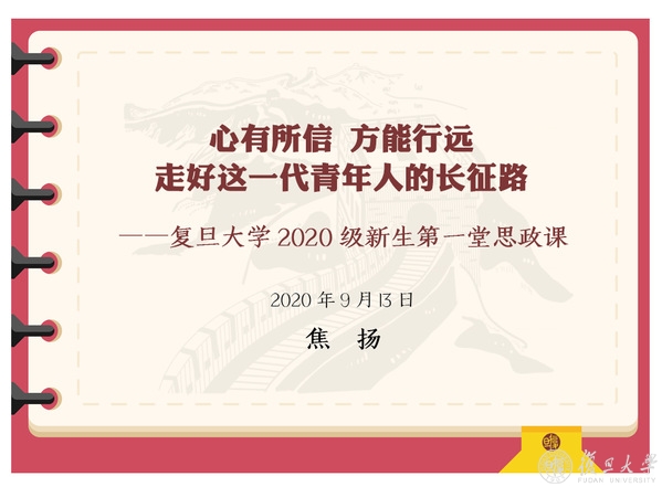 何以行远?在这堂以“心有所信,方能行远,走好这一代青年人的长征路”为主题的思政课上,焦扬从习近平总书记给复旦大学《共产党宣言》展示馆党员志愿服务队全体队员的回信说起,围绕心有所信的“信”,和新生们谈理想信念,说复旦人信则行远的故事,聊当代青年笃志行远的新长征和自迩行远的成长之道。
