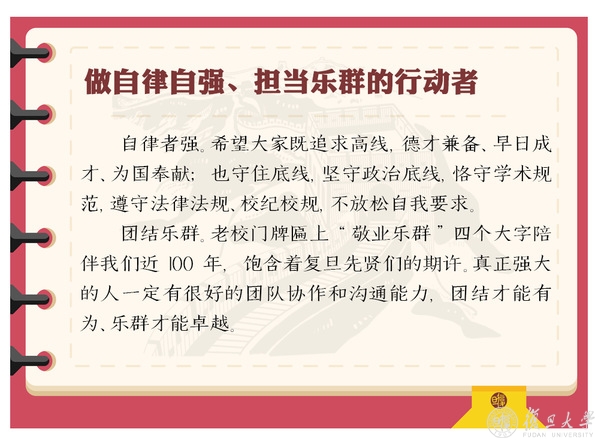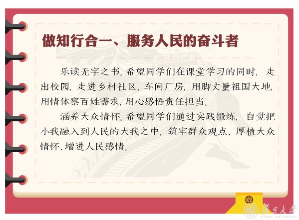 “复旦人应该以天下和人民福祉为己任,思考大问题、追寻大意义,同时又有务实的行动、朴实的生活,明白人生的绚烂来自坚忍不拔、锲而不舍的坚守。”