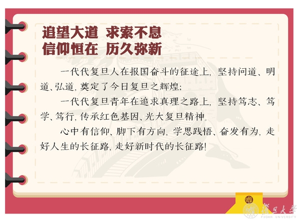“追望大道,求索不息;信仰恒在,历久弥新。100年来,一代代复旦人在报国奋斗的征途上,坚持问道、明道、弘道,奠定了今日复旦之辉煌;一代代复旦青年在追求真理之路上,坚持笃志、笃学、笃行,传承红色基因、光大复旦精神。”