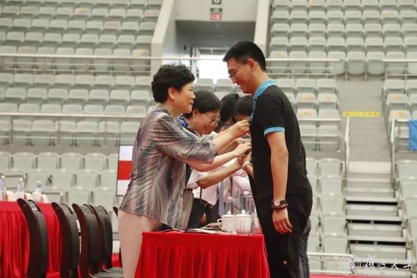 在主席台就座的领导和老师们为新生代表授戴校徽。