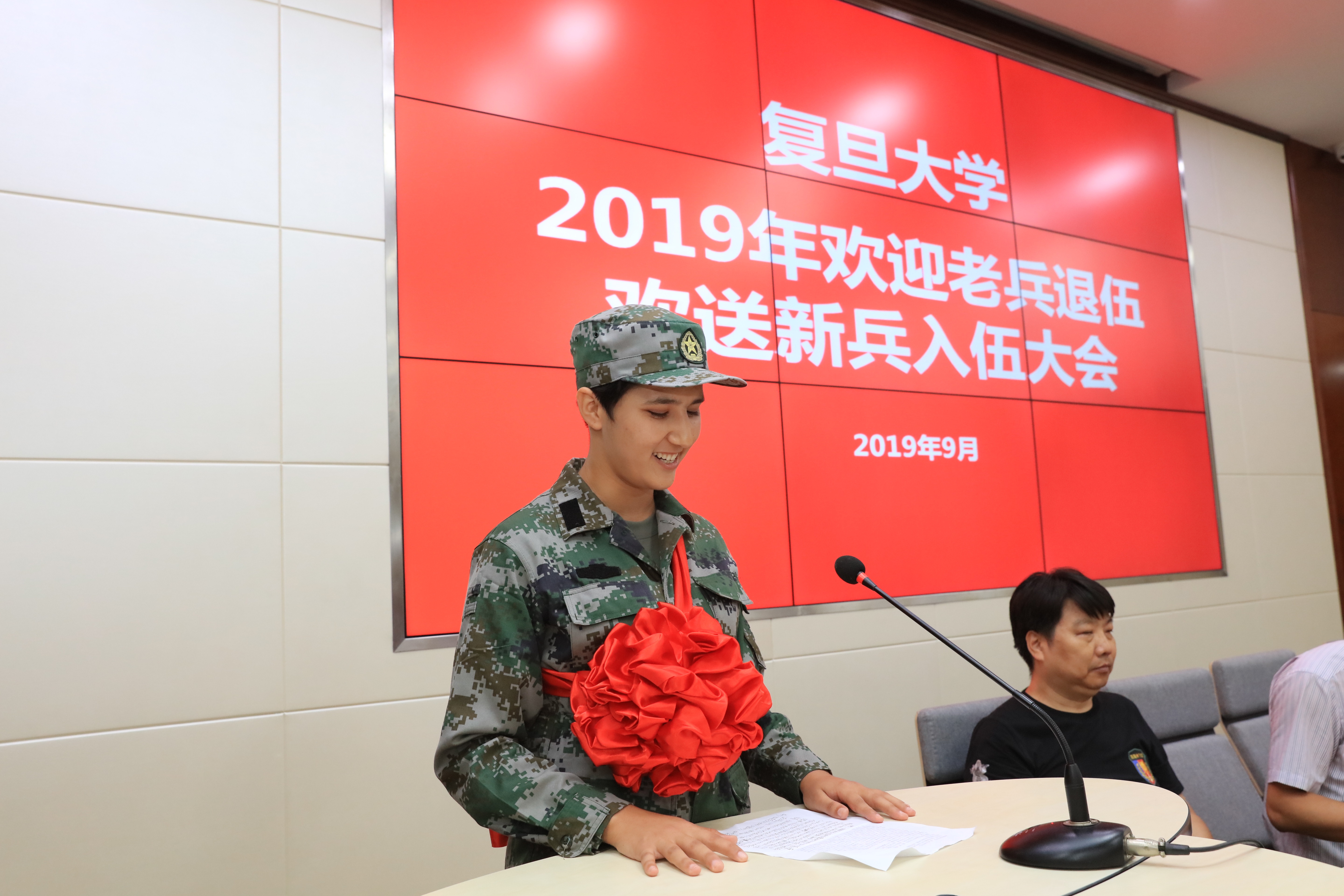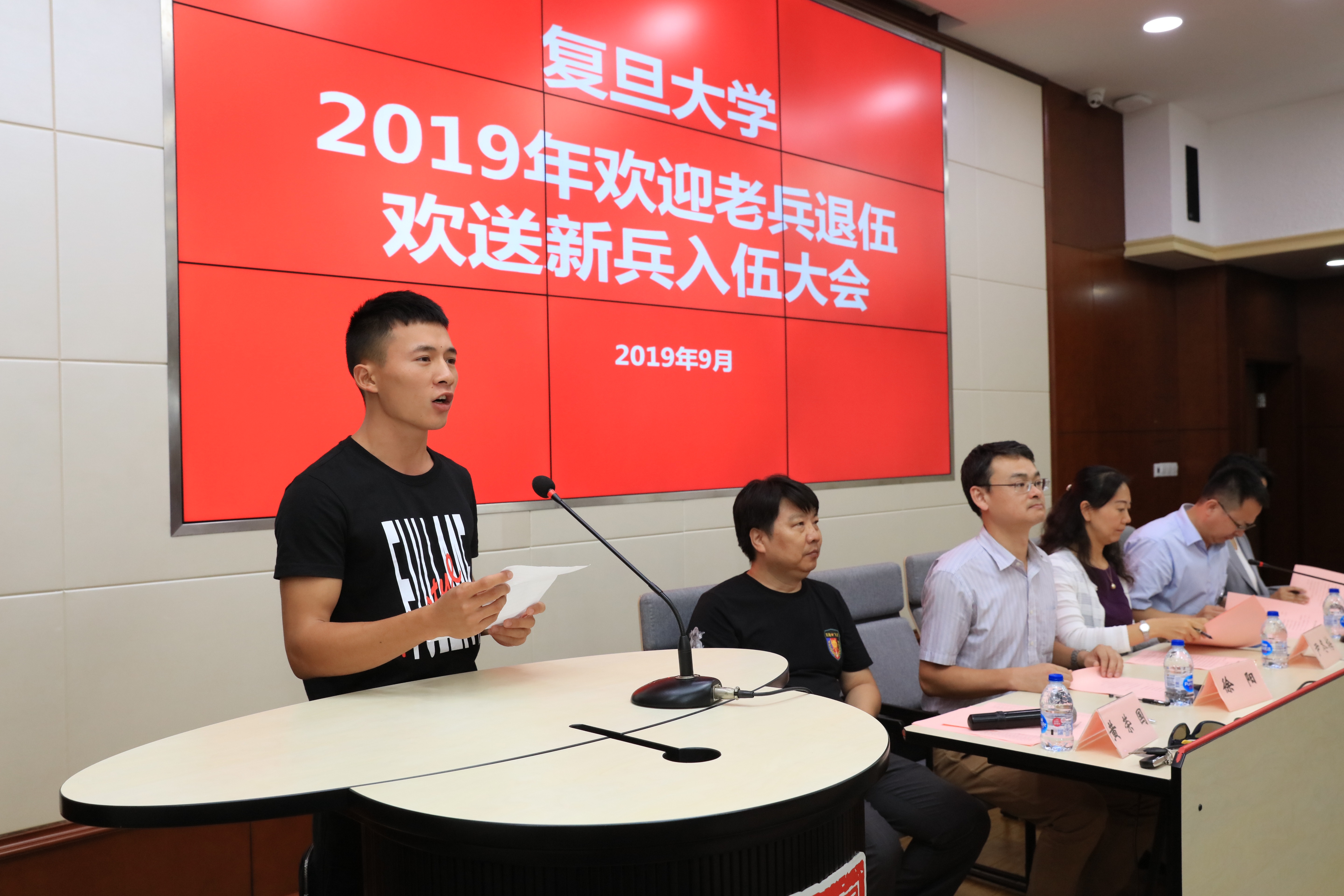 2019年9月18日下午,复旦大学2019年欢迎老兵退伍欢送新兵入伍大会在邯郸校区美研中心108室隆重举行。校党委副书记尹冬梅,武装部、学工部和研工部负责人出席大会,2019年退伍学生、入伍学生和部分院系学工负责人、辅导员等参加大会。