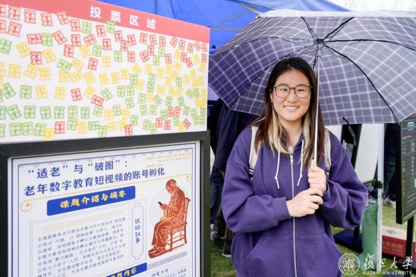 在新闻学院的《“适老”与“破圈”:老年数字教育短视频的账号孵化》课题海报前,则展现了另一种“人机协作”。