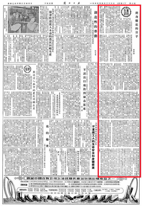 从前线工作回来不久,我就被邀列席参加中国人民政治协商会议第一届全国委员会第三次会议。在会上听了许多报告,使我对新中国各方面的伟大成就有了总的认识,这使我更深切体会到胜利之得来不易,只有在中国共产党领导下,国家在短短两年的时间中才获得了那么大的成就。在闭会的宴会上,我有幸得和我们的伟大领袖毛主席坐在一桌,听到他的指示。毛主席领导革命,经过几十年的艰苦奋斗,使全国人民获得解放,做了翻天覆地的伟大事业,可是他对我们却是那样谦和,那样的亲切与关怀,使我们在他面前一点不觉得拘谨。我回顾自己,只要工作中稍微有点成绩便沾沾自喜,表现出骄傲自满情绪,面对我们伟大的领袖,我感到真是羞惭无地。第二天,刘少奇同志又给我们做了个报告,谈到共产党员标准的八项条件。这个报告进一步启发了我,使我决心去除为个人名利打算的自私观点,争取做一个光荣的共产党员,终身为伟大的共产主义事业服务。