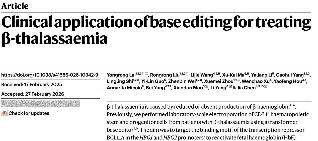 2026年4月8日, 复旦大学生物医学研究院杨力团队联合广西医科大学第一附属医院、上海科技大学和正序生物合作在《自然》(Nature)发表临床研究成果“Clinical application of base editing for treating β-thalassaemia”。该研究介绍了利用变形式碱基编辑器tBE(transformer Base Editor)开发的碱基编辑药物CS-101注射液治疗β-地中海贫血患者的IIT临床试验结果,5名β-地贫患者在接受治疗后,造血功能快速重建,总血红蛋白和HbF水平迅速提升且持续高水平表达,并迅速摆脱输血依赖。