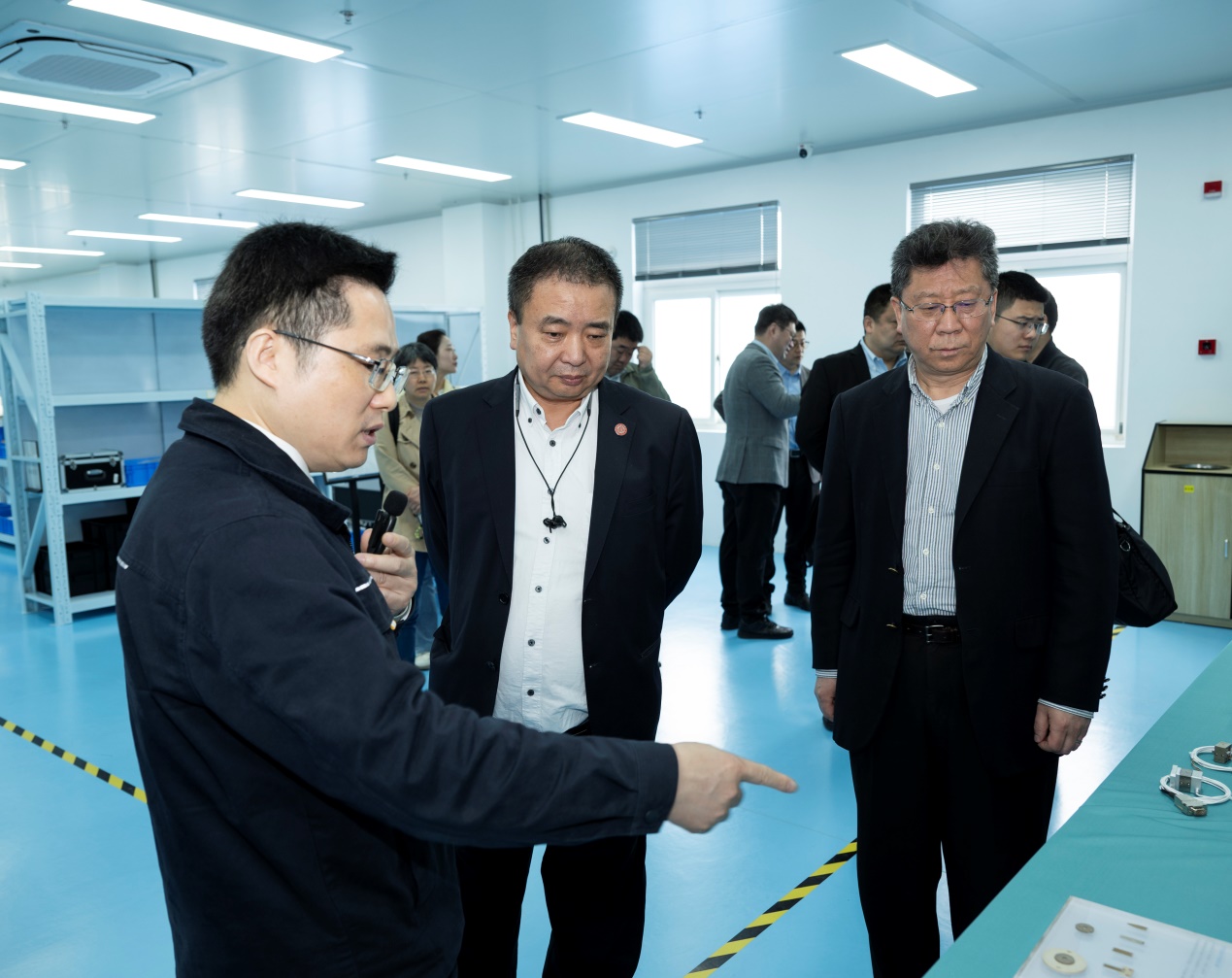 在公司首席科学家、复旦大学教授杨晓峰及董事长、总经理吴立伟的陪同下,金力实地参观了公司的精密运控平台净化间、压电与电机等实验室,深入了解了公司在核心技术攻关、产品研发及产业化方面取得的显著进展。